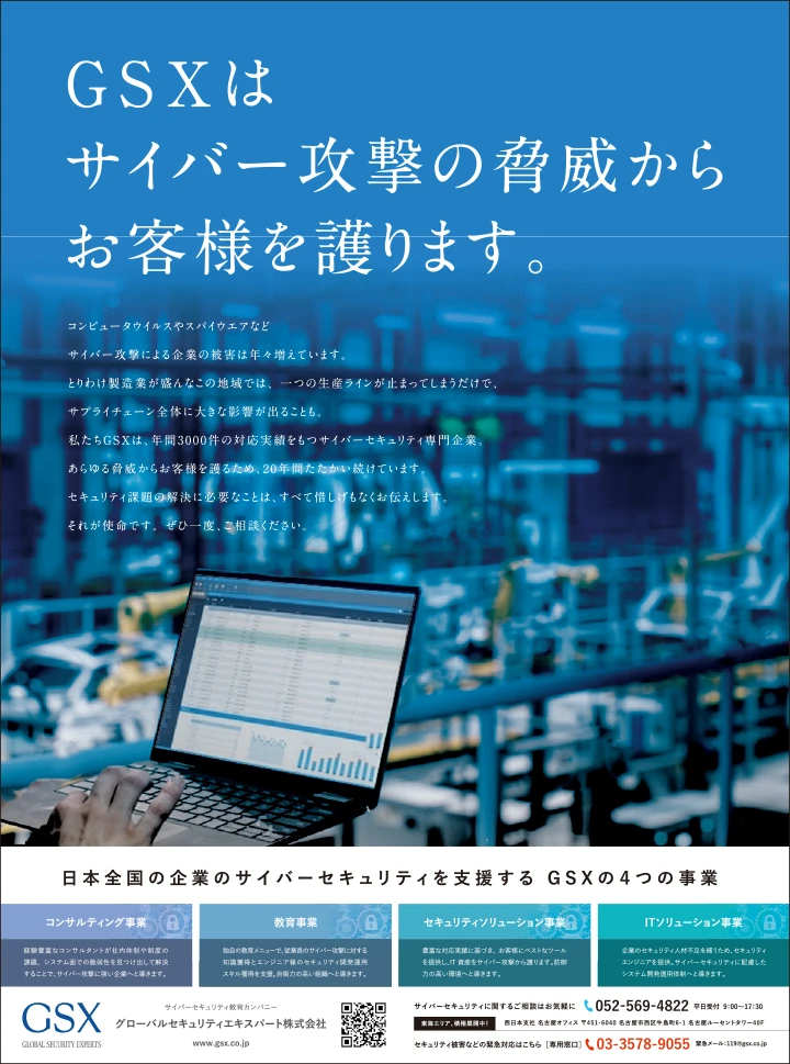 9月26日中日新聞朝刊への一面広告を掲載しました。東海エリアは自動車関連企業など、サプライチェーン対応が求められるお客様が多くいらっしゃいます。GSXはコンサルティングなどのソリューション提供を通じて、東海エリアのお客様の自衛力向上に貢献して参ります。