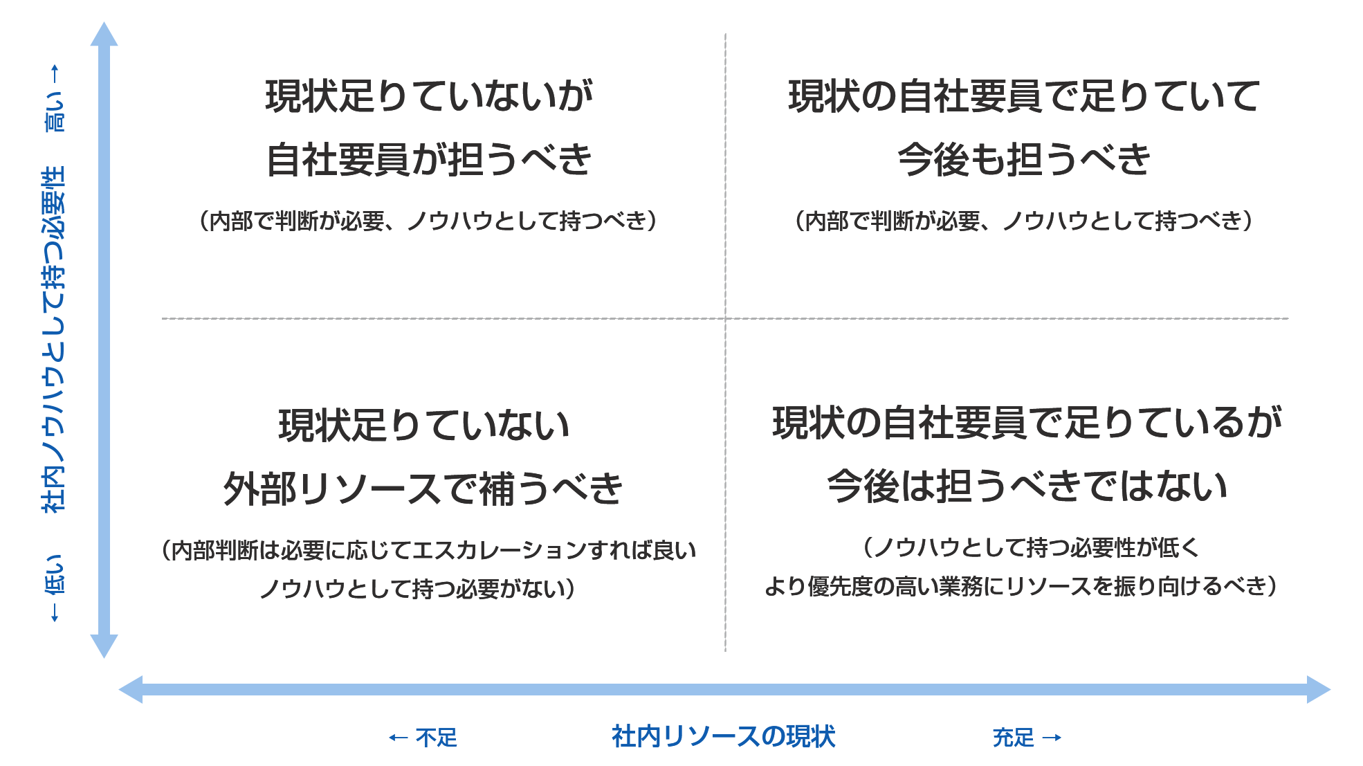 要員が担う業務を見直す場合、スキルアンマッチやモチベーションの問題等、細かくは色々とありますが、まずはべき論で考えることが、整理を進めるポイントです。